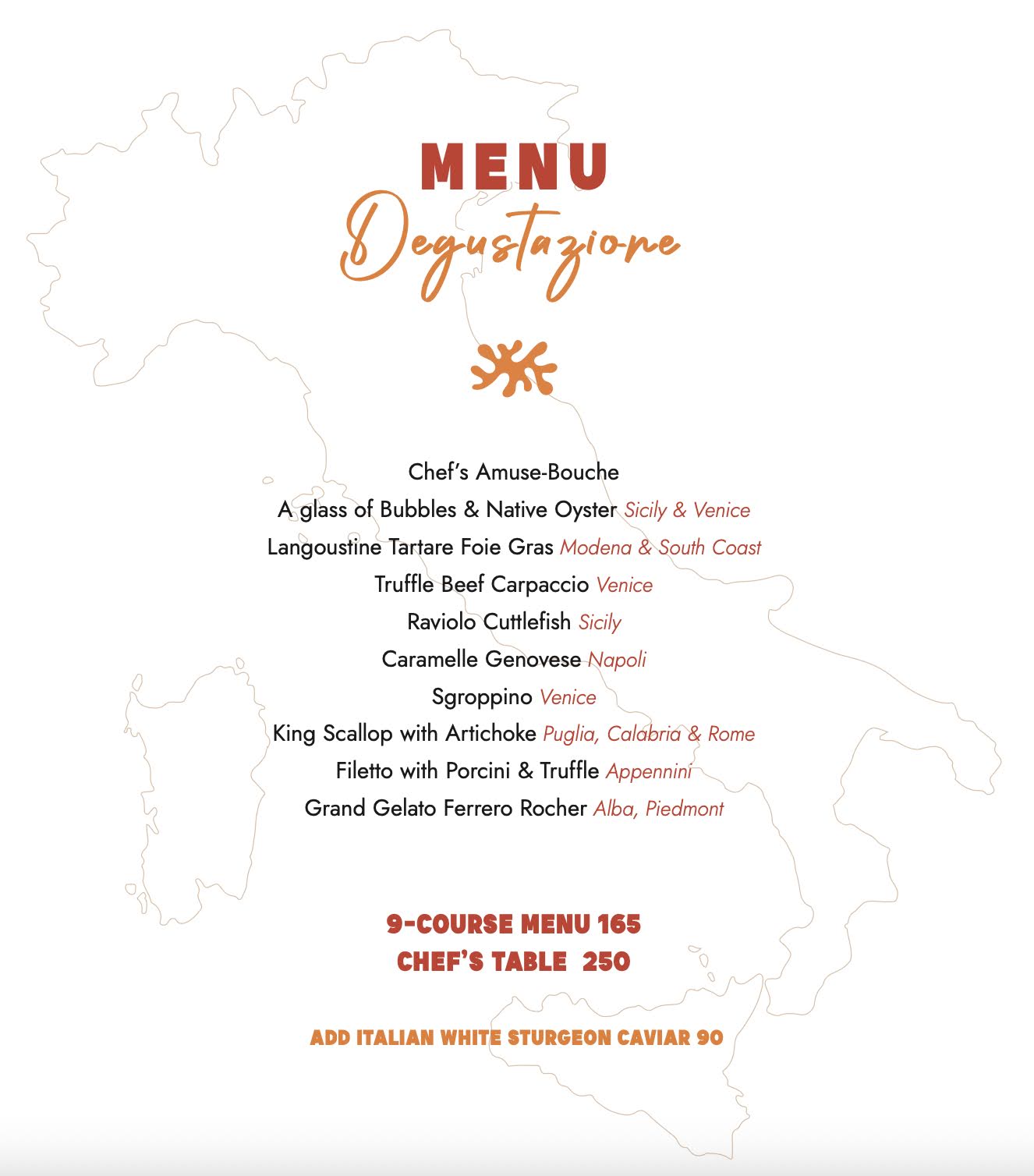 Menu highlights include Langoustine Tartare Foie Gras, Filetto with Porcini & Truffle and our viral dessert - the Grand Gelato Ferrero Rocher.
